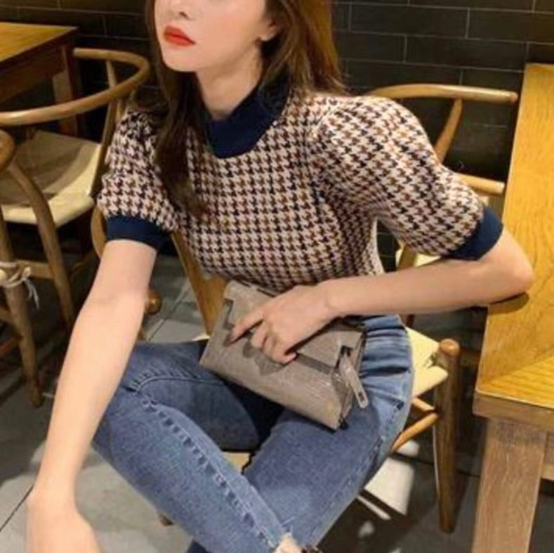 Top com manga bufante estampa pied-de-poule(Azul marinho&Bege)